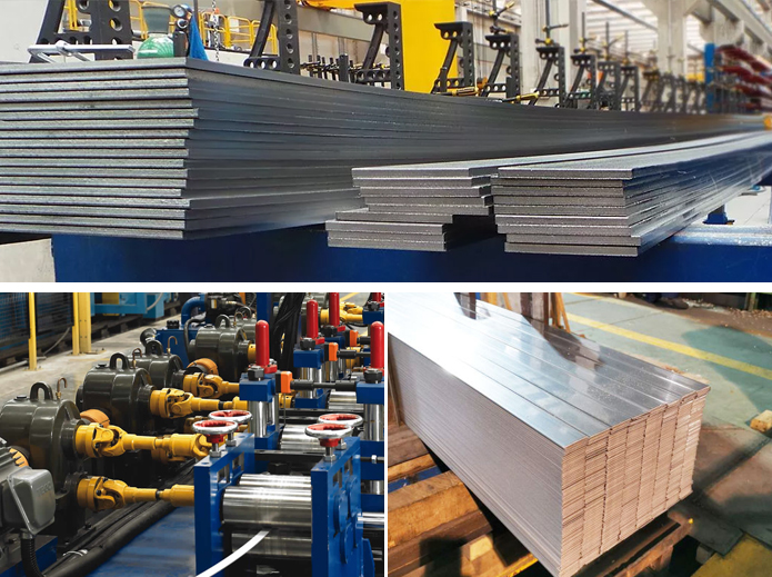 横切开平设备有2台,最大上卷重量40T,具备附纸、附膜功能,可消除65%左右的板形缺陷(如边波浪、腹波浪、翘曲、横弯等)。堆垛功能:气垫式垛板、翻板架堆垛,拍板功能。具有加工精度高、消除原材料应用、板面保护等优势。