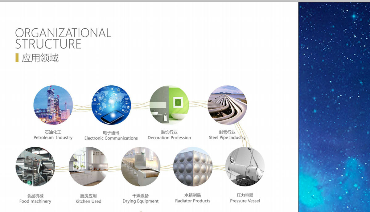 拥有进口钢铁加工设备、理化检测中心和“裁剪、切割、表面研磨、成型、焊接、精密钣金、机加工”9大加工中心可对不锈钢材料进行精密开平、分条、剪板、油磨拉丝、整卷覆膜拉丝、8K镜面、BA、磨砂、雪花砂、无指纹、彩色不锈钢等加工